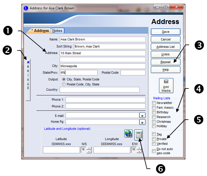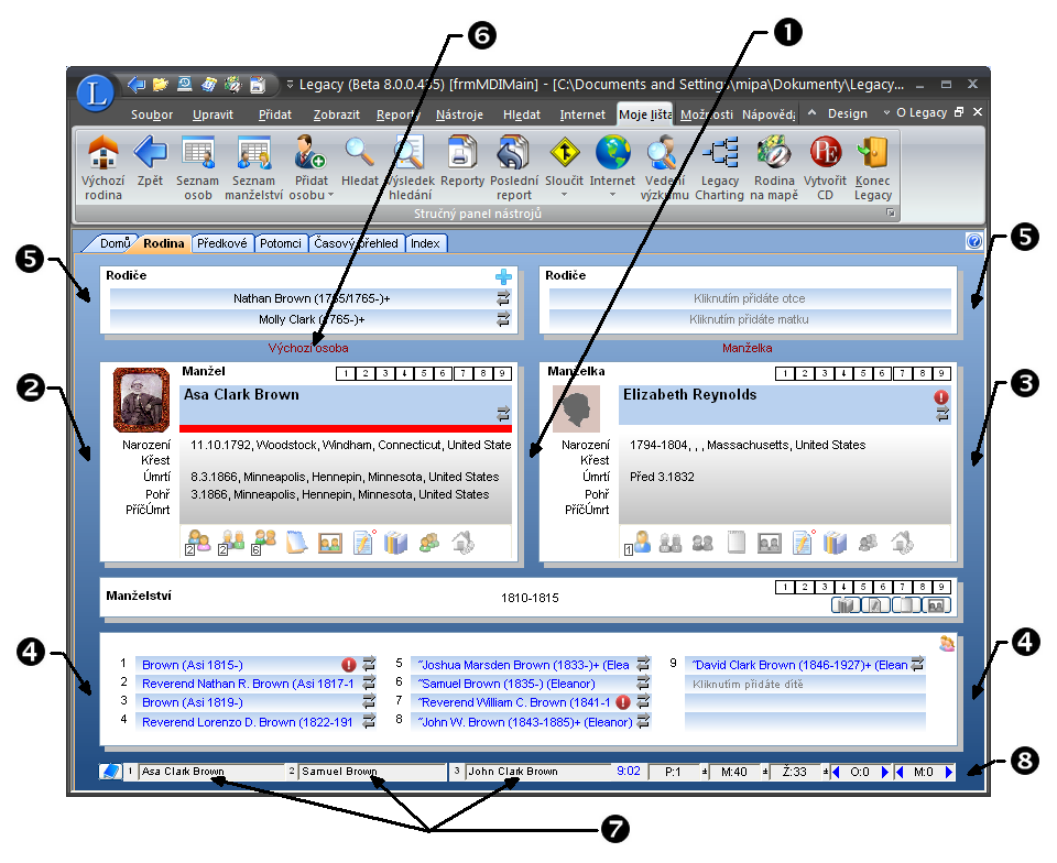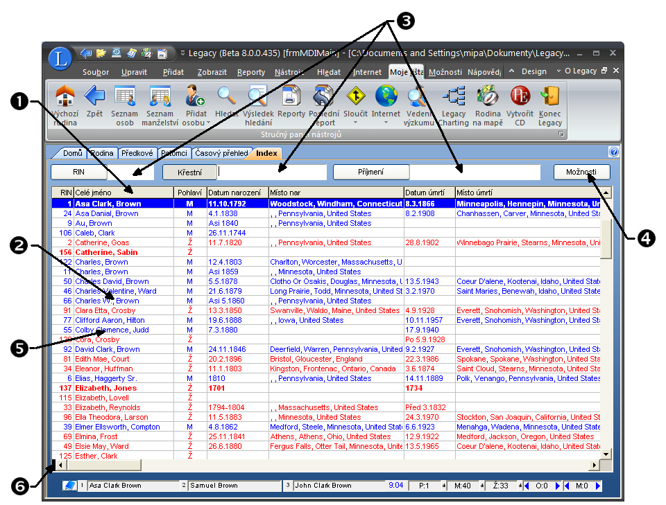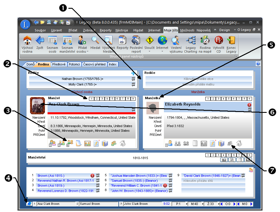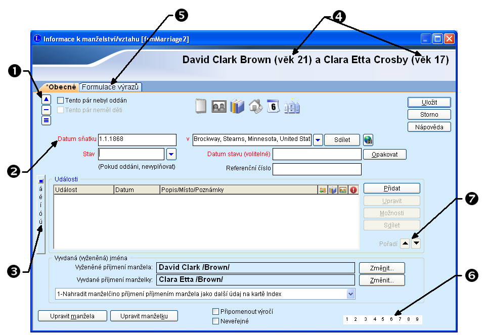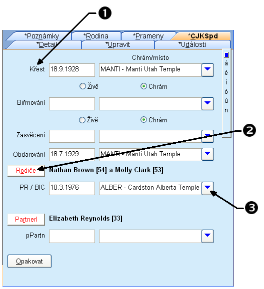 Kliknutím pravým tlačítkem myši na jednu z těchto tří oblastí nastavíte Rychlou záložku na aktuální osobu (Manžela nebo Manželku). Následným kliknutím levým tlačítkem myši na jedno z těchto tří jmen na tuto osobu přeskočíte bez ohledu na to, kde se v databázi nacházíte. Chcete-li Rychlou záložku vyčistit, stiskněte klávesu Ctrl a na jméno klikněte pravým tlačítkem myši.