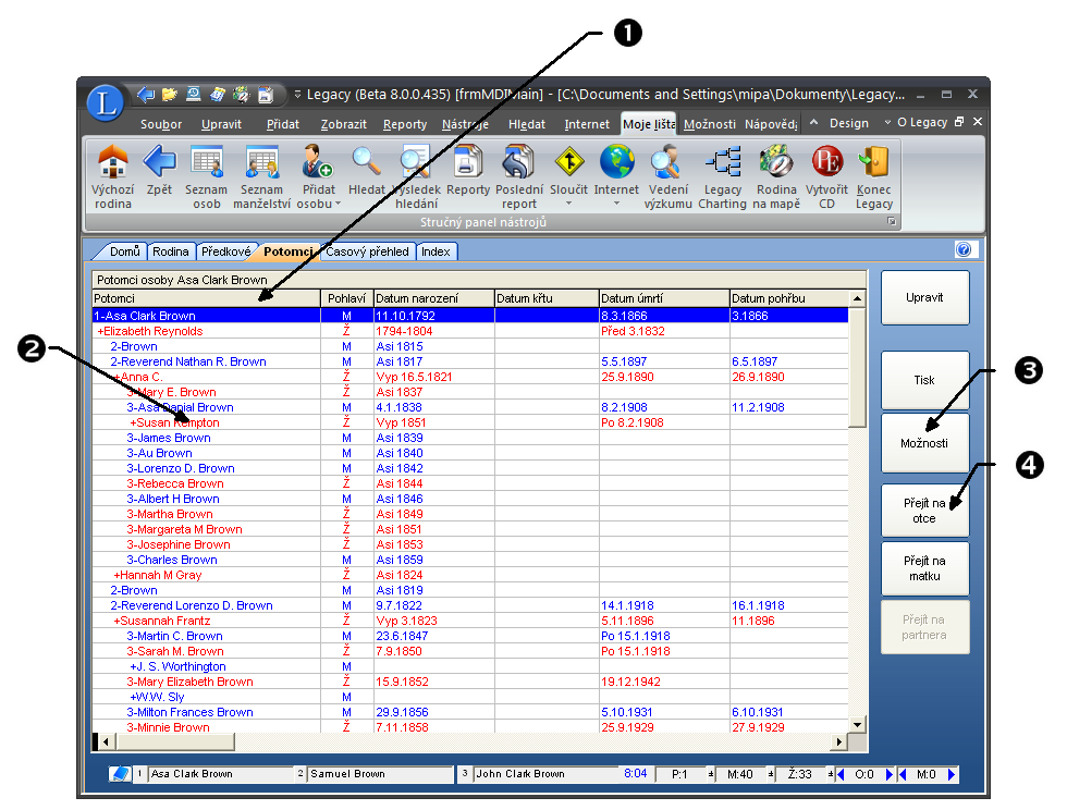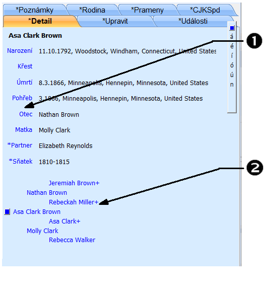 Kliknutím na Přejít na otce nebo Přejít na matku přeskočíte na otce nebo matku zvýrazněného potomka.
