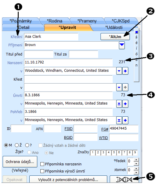 Kliknutí na AltJm vám umožní zapsat alternativní jména.