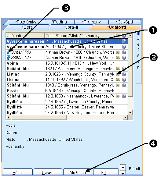 Tlačítko Možnosti vám umožní zaměnit údaj události za základní události (narození, křest, úmrtí nebo pohřeb) nebo seřadit seznam událostí podle data nebo názvu. Událost ze seznamu můžete také odstranit.