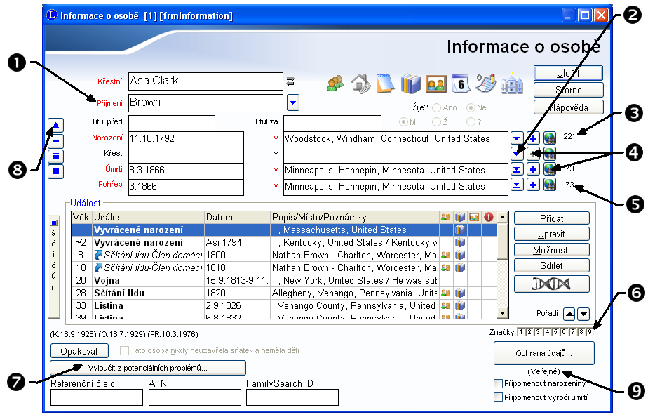 Toto číslo ukazuje, před kolika lety se osoba narodila. Zobrazení tohoto čísla můžete vypnout a zapnout kliknutím pravým tlačítkem myši na hodnotu.