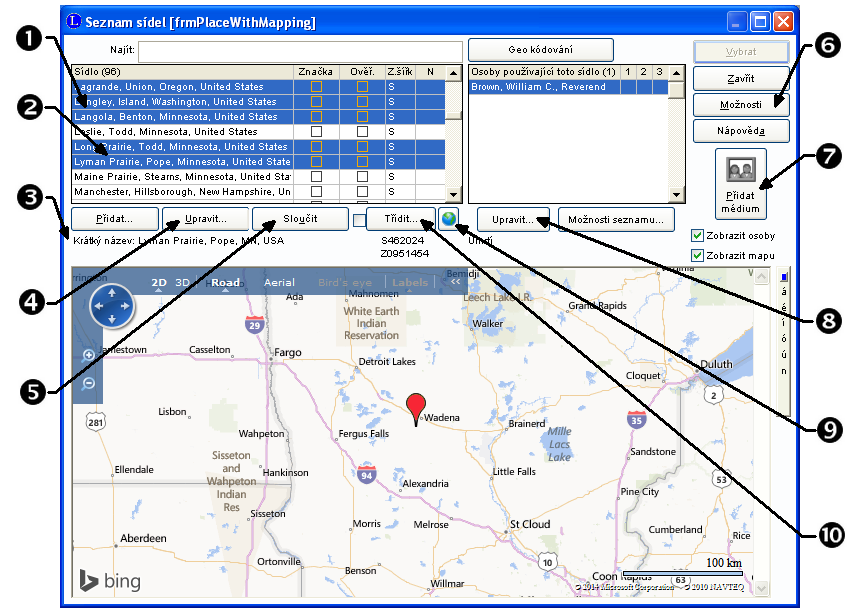 Kliknutí na Upravit vám pro aktuálně zvýrazněné sídlo umožní přidat krátký název sídla, poznámky a údaje o zemepisných souřadnicích.