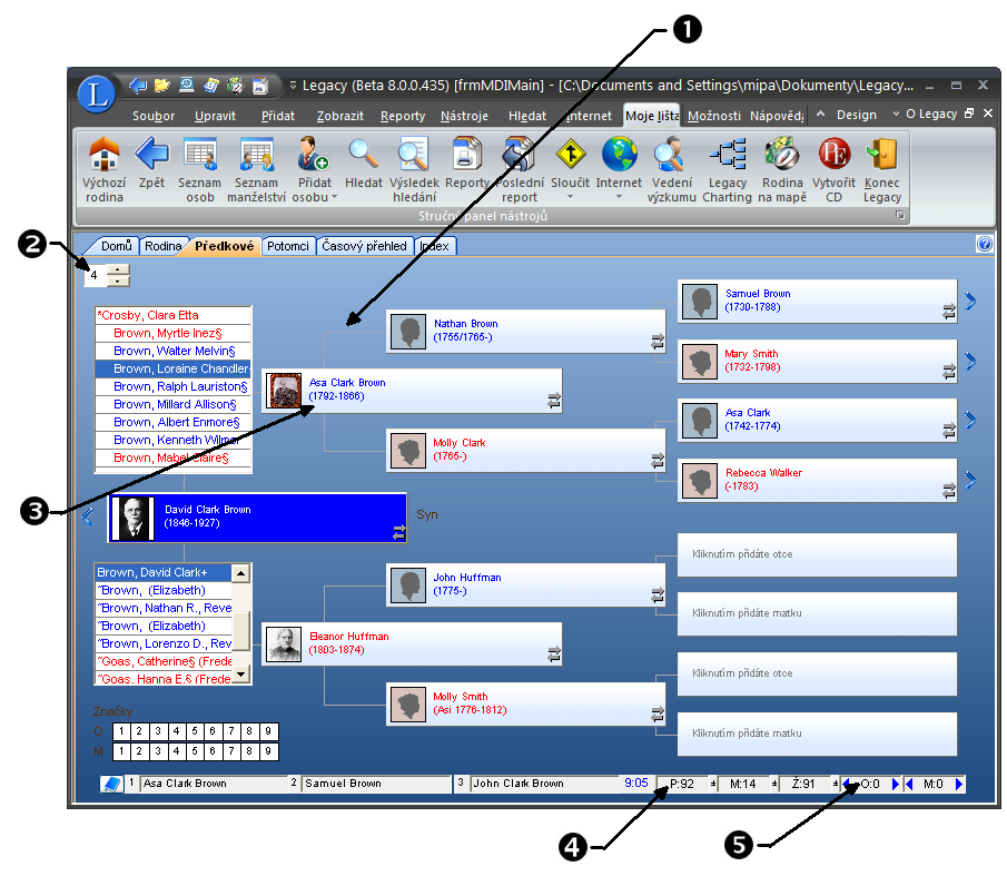 Použijte šipky doleva nebo doprava k přesunu na další nebo předchozí záznamy se značkou. O = značky osoby, M = značky manželství.