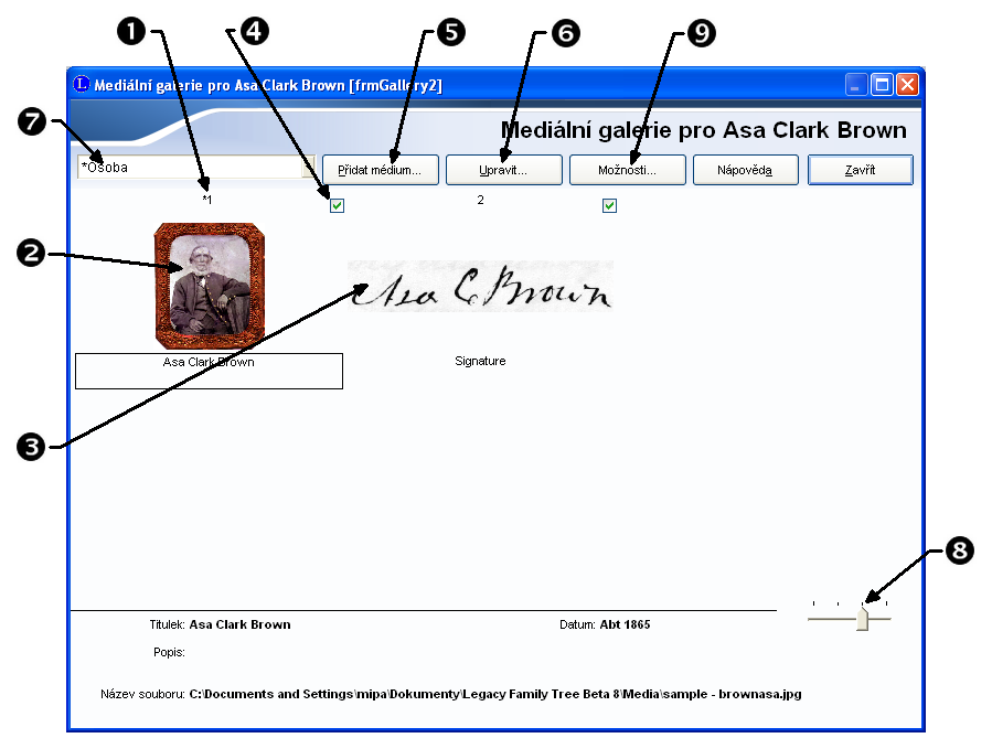 Hvězdička (*) označuje preferovaný obrázek, který je zobrazován na obrazovce a tištěn v reportech. (Můžete také vytisknout obrázkové album, které bude obsahovat všechny obrázky určité osoby.) Preferovaný obrázek můžete změnit, kliknete-li na něj pravým tlačítkem myši a z menu vyberete Nastavit jako preferovaný.