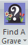 Pokud kliknete na horní část tohoto tlačítka, přejdete se na web FindAGrave.com, a to buď na pomník aktuální osoby (pokud máte v Legacy zaznamenané číslo pomníku) nebo na obrazovku vyhledávání pro aktuální osobu. Pokud kliknete na spodní část tlačítka, objeví se vyskakovací menu, kde se můžete rozhodnout, zda chcete přejít na pomník nebo provést hledání na webu FindAGrave.com, vytvořit seznam osob s pomníkem na FindAGrave.com nebo vytvořit seznam zemřelých osob bez pomníku na FindAGrave.com.
